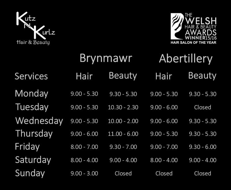 Salon Opening Hours @ Kutz N Kurlz Hair and Beauty Brynmawr Abertillery Blaenau Gwent South Wales UK